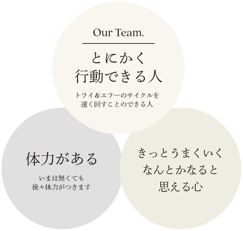私を含め、今働いているスタッフは全員未経験からのスタートでしたが、全員行動力がある人です。